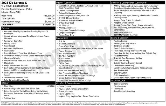 Panthera Metal 2026 Kia Sorento S FWD 8-Speed Automatic 2.5L I4 DGI DOHC 16V LEV3-SULEV30 191hp