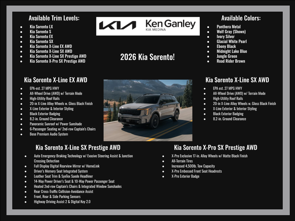 2026 Pantherametal Kia Sorento S 2.5L I4 DGI DOHC 16V LEV3-SULEV30 191hp AWD AWD.