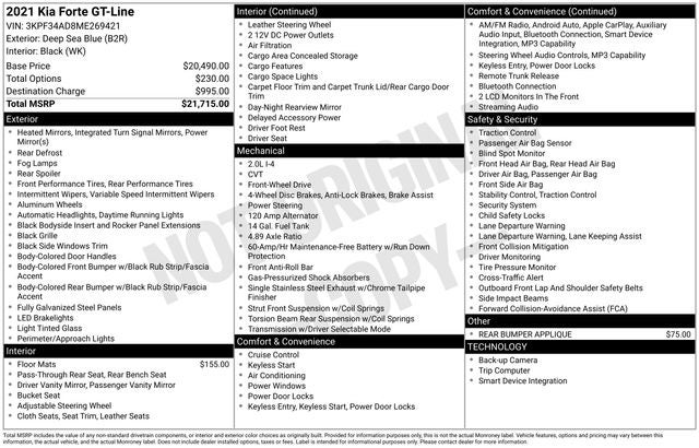 Recent Arrival! Clean CARFAX. Forte GT-Line. 2021 Kia Forte GT-Line FWD CVT Kia Certified Pre-Owned- You get reliability and peace of mind knowing that every Kia Certified Pre-Owned (CPO) has undergone a thorough 165-Point Quality Assurance Inspection. From brakes to electrical to engine, we inspect every vehicle to make sure they meet our highest standard. All Kia Certified Pre-Owned vehicles come with: •10 Year / 100,000 Mile Limited Powertrain Warranty • Includes 1 Year / 12,000 Mile Platinum Coverage • Travel Breakdown Coverage up to $100 per calendar day, up to $500 per covered mechanical breakdown.• Emergency Towing Coverage Up to $75 per covered mechanical breakdown• Rental Car Coverage up to $35 per day, max 10 days, per covered mechanical breakdown • Cross Country Motor Club Driver’s OneCard Membership, that includes:- Flat Tire: Change your flat tire with your inflated spare - Out of Gas: Arrange to have up to three gallons of free gas delivered if your vehicle runs out of fuel - Lockout: Assist in getting vehicle unlocked if the keys are lost, broken or locked inside your vehicle - Jump-Start: Arrange a battery jump. 2.0L 4-Cylinder MPI