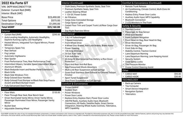 Recent Arrival! CARFAX One-Owner. Clean CARFAX. One Owner & Clean Carfax!!, Forte GT, Navigation System, Wheels: 18 Machine Finish Alloy. 2022 Kia Forte GT FWD 7-Speed Automatic Kia Certified Pre-Owned- You get reliability and peace of mind knowing that every Kia Certified Pre-Owned (CPO) has undergone a thorough 165-Point Quality Assurance Inspection. From brakes to electrical to engine, we inspect every vehicle to make sure they meet our highest standard. All Kia Certified Pre-Owned vehicles come with: •10 Year / 100,000 Mile Limited Powertrain Warranty • Includes 1 Year / 12,000 Mile Platinum Coverage • Travel Breakdown Coverage up to $100 per calendar day, up to $500 per covered mechanical breakdown.• Emergency Towing Coverage Up to $75 per covered mechanical breakdown• Rental Car Coverage up to $35 per day, max 10 days, per covered mechanical breakdown • Cross Country Motor Club Driver’s OneCard Membership, that includes:- Flat Tire: Change your flat tire with your inflated spare - Out of Gas: Arrange to have up to three gallons of free gas delivered if your vehicle runs out of fuel - Lockout: Assist in getting vehicle unlocked if the keys are lost, broken or locked inside your vehicle - Jump-Start: Arrange a battery jump. 1.6L 4-Cylinder