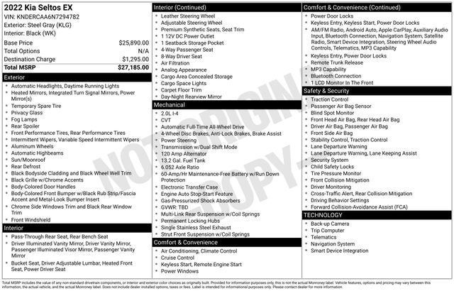 Recent Arrival! CARFAX One-Owner. Clean CARFAX. Seltos EX. 2022 Kia Seltos EX AWD CVT Kia Certified Pre-Owned- You get reliability and peace of mind knowing that every Kia Certified Pre-Owned (CPO) has undergone a thorough 165-Point Quality Assurance Inspection. From brakes to electrical to engine, we inspect every vehicle to make sure they meet our highest standard. All Kia Certified Pre-Owned vehicles come with: •10 Year / 100,000 Mile Limited Powertrain Warranty • Includes 1 Year / 12,000 Mile Platinum Coverage • Travel Breakdown Coverage up to $100 per calendar day, up to $500 per covered mechanical breakdown.• Emergency Towing Coverage Up to $75 per covered mechanical breakdown• Rental Car Coverage up to $35 per day, max 10 days, per covered mechanical breakdown • Cross Country Motor Club Driver’s OneCard Membership, that includes:- Flat Tire: Change your flat tire with your inflated spare - Out of Gas: Arrange to have up to three gallons of free gas delivered if your vehicle runs out of fuel - Lockout: Assist in getting vehicle unlocked if the keys are lost, broken or locked inside your vehicle - Jump-Start: Arrange a battery jump. 2.0L I4 MPI