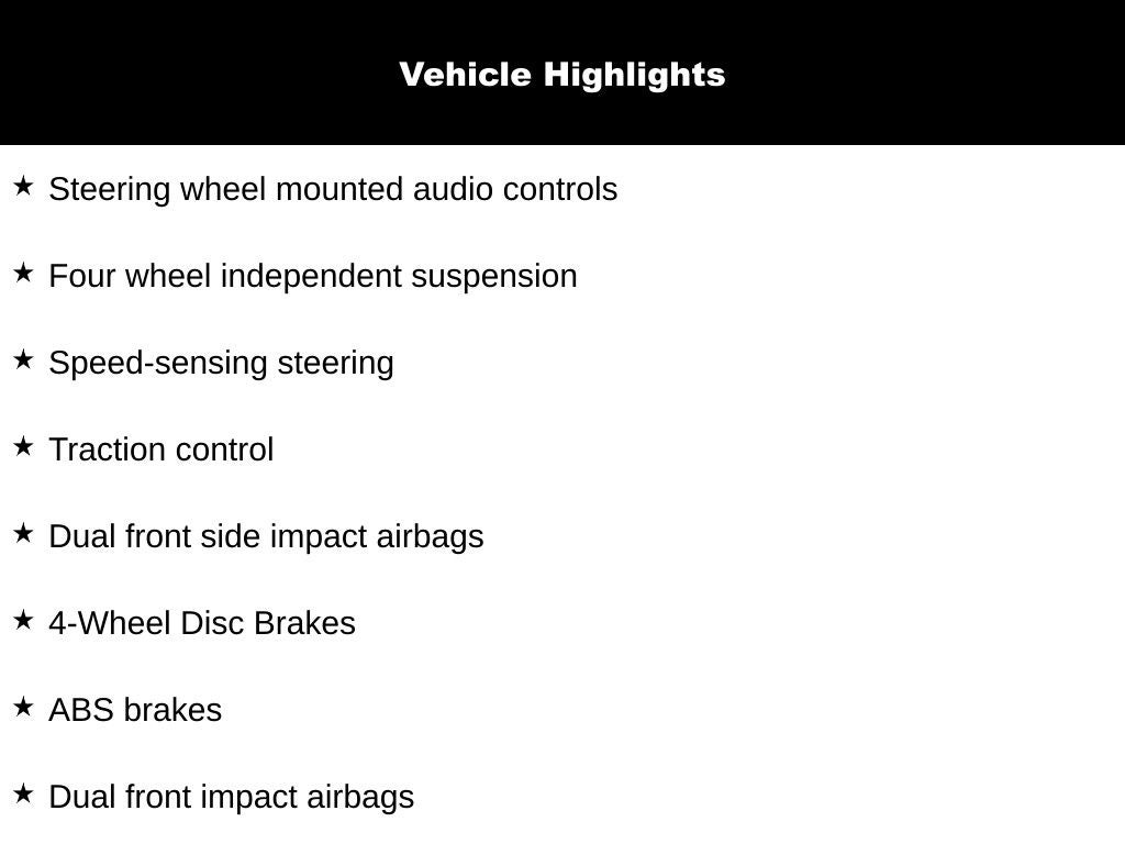 - Radio w/Seek-Scan, Clock, Speed Compensated Volume Control, Aux Audio Input Jack, Steering Wheel Controls and Radio Data System