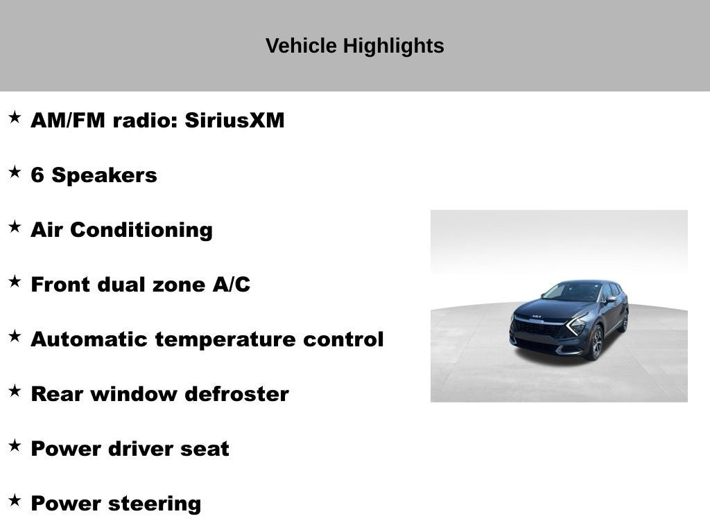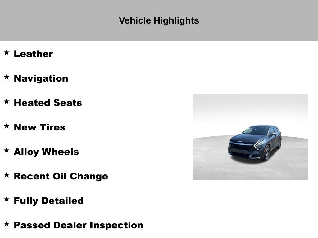 2023 Gravity Gray Kia Sportage EX New Price! CARFAX One-Owner. Clean CARFAX. Leather, Navigation, Heated Seats, Alloy Wheels, Recent Oil Change, Fully Detailed, Passed Dealer Inspection, 4-Wheel Disc Brakes, 6 Speakers, ABS brakes, Air Conditioning, Alloy wheels, AM/FM radio: SiriusXM, Auto High-beam Headlights, Automatic temperature control, Brake assist, Delay-off headlights, Dual front impact airbags, Dual front side impact airbags, Electronic Stability Control, Four wheel ..independent suspension, Front dual zone A/C, Fully automatic headlights, Heated front seats, Illuminated entry, Leatherette Seat Trim, Navigation System, Outside temperature display, Panic alarm, Power door mirrors, Power driver seat, Power steering, Power windows, Rain sensing wipers, Rear window defroster, Rear window wiper, Remote keyless entry, Security system, Speed control, Speed-sensing steering, Steering wheel mounted audio controls, Telescoping steering wheel, Tilt steering wheel, Traction control, Turn signal indicator mirrors, Variably intermittent wipers. Certified. Kia Certified Pre-Owned Details: