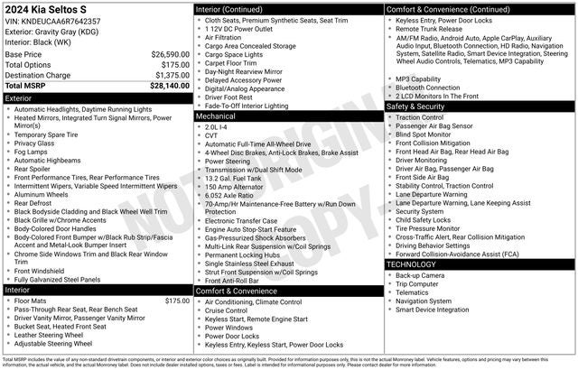Recent Arrival! CARFAX One-Owner. Clean CARFAX. Seltos S. 2024 Kia Seltos S AWD CVT Kia Certified Pre-Owned- You get reliability and peace of mind knowing that every Kia Certified Pre-Owned (CPO) has undergone a thorough 165-Point Quality Assurance Inspection. From brakes to electrical to engine, we inspect every vehicle to make sure they meet our highest standard. All Kia Certified Pre-Owned vehicles come with: •10 Year / 100,000 Mile Limited Powertrain Warranty • Includes 1 Year / 12,000 Mile Platinum Coverage • Travel Breakdown Coverage up to $100 per calendar day, up to $500 per covered mechanical breakdown.• Emergency Towing Coverage Up to $75 per covered mechanical breakdown• Rental Car Coverage up to $35 per day, max 10 days, per covered mechanical breakdown • Cross Country Motor Club Driver’s OneCard Membership, that includes:- Flat Tire: Change your flat tire with your inflated spare - Out of Gas: Arrange to have up to three gallons of free gas delivered if your vehicle runs out of fuel - Lockout: Assist in getting vehicle unlocked if the keys are lost, broken or locked inside your vehicle - Jump-Start: Arrange a battery jump. 2.0L I4 MPI