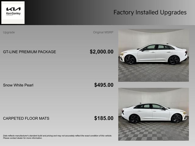 Recent Arrival! CARFAX One-Owner. K5 GT-Line, Navigation System, Wheels: 18 x 7.5J Gloss Black Machined Finish Alloy. 2025 Kia K5 GT-Line AWD 8-Speed Automatic Kia Certified Pre-Owned- You get reliability and peace of mind knowing that every Kia Certified Pre-Owned (CPO) has undergone a thorough 165-Point Quality Assurance Inspection. From brakes to electrical to engine, we inspect every vehicle to make sure they meet our highest standard. All Kia Certified Pre-Owned vehicles come with: •10 Year / 100,000 Mile Limited Powertrain Warranty • Includes 1 Year / 12,000 Mile Platinum Coverage • Travel Breakdown Coverage up to $100 per calendar day, up to $500 per covered mechanical breakdown.• Emergency Towing Coverage Up to $75 per covered mechanical breakdown• Rental Car Coverage up to $35 per day, max 10 days, per covered mechanical breakdown • Cross Country Motor Club Driver’s OneCard Membership, that includes:- Flat Tire: Change your flat tire with your inflated spare - Out of Gas: Arrange to have up to three gallons of free gas delivered if your vehicle runs out of fuel - Lockout: Assist in getting vehicle unlocked if the keys are lost, broken or locked inside your vehicle - Jump-Start: Arrange a battery jump. I4