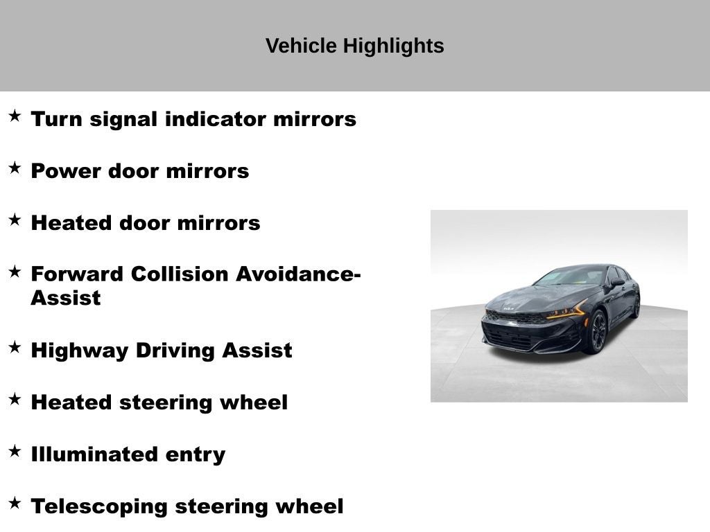 2023 Ebony Black Kia K5 GT-Line CARFAX One-Owner. Clean CARFAX. Navigation, All Wheel Drive, Alloy Wheels, Recent Oil Change, Fully Detailed, Passed Dealer Inspection, 4-Wheel Disc Brakes, 6 Speakers, ABS brakes, Air Conditioning, Alloy wheels, Apple CarPlay & Android Auto, Auto High-beam Headlights, Automatic temperature control, Brake assist, Delay-off ..headlights, Driver vanity mirror, Dual front impact airbags, Dual front side impact airbags, Electronic Stability Control, Forward Collision Avoidance-Assist, Four wheel independent suspension, Front dual zone A/C, Front fog lights, Fully automatic headlights, GT-Line Premium Package, Heated door mirrors, Heated front seats, Heated steering wheel, Highway Driving Assist, Illuminated entry, LED Projection Headlamps, Navigation System, Outside temperature display, Panic alarm, Passenger vanity mirror, Power door mirrors, Power driver seat, Power steering, Power windows, Radio data system, Radio: AM/FM/MP3 Audio System, Rear window defroster, Remote keyless entry, Security system, Smart Cruise Control w/Stop & Go, Speed control, Speed-sensing steering, Steering wheel mounted audio controls, Telescoping steering wheel, Tilt steering wheel, Traction control, Turn signal indicator mirrors, Variably intermittent wipers. Certified. Kia Certified Pre-Owned Details: